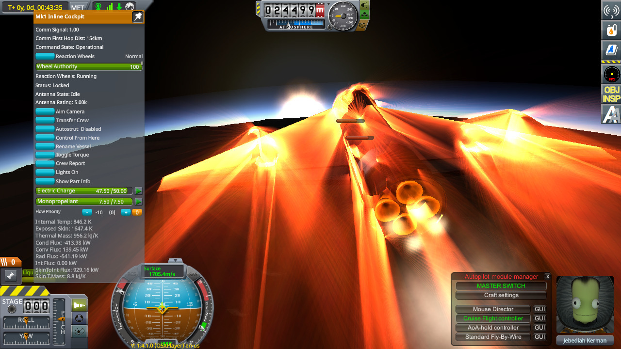 Jeb : _ I'm fine, but I think I almost lost the nose cone - she was still building up internal heat while decelerating, my temp gauges only started to drop slightly below 1400 IAS. Well, this flight finally got interesting. Over